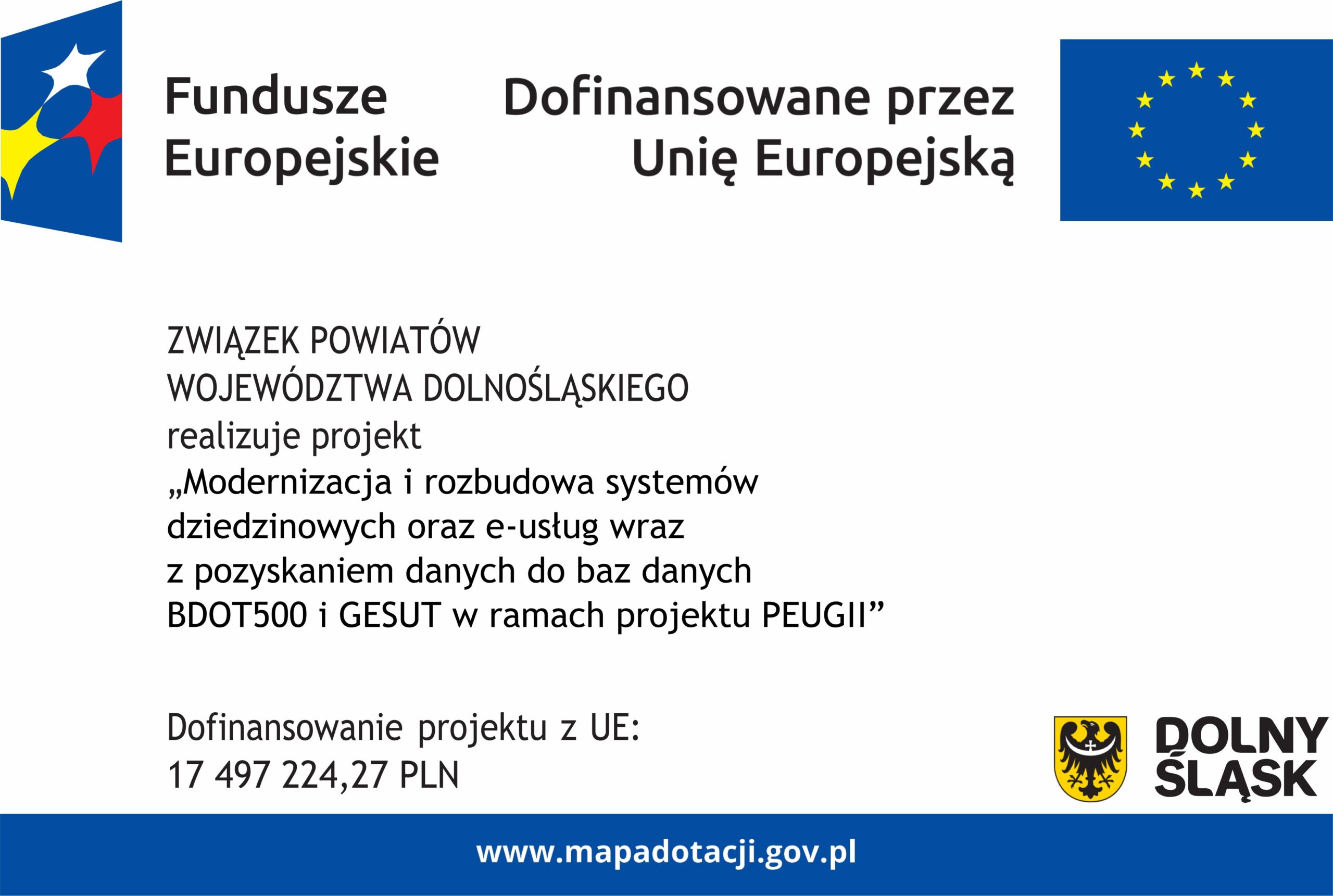 Projekt pn. „Modernizacja i rozbudowa systemów dziedzinowych oraz e-usług wraz z pozyskaniem danych do baz danych BDOT500 i GESUT w ramach projektu PEUG II” realizowany jest przez Związek Powiatów Województwa Dolnośląskiego (Partnera Wiodącego) w partnerstwie z 26 Partnerami Projektu tj.: …