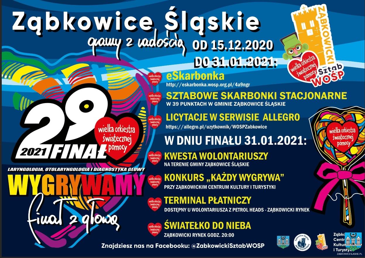 29 Finał Wielkiej Orkiestry Świątecznej Pomocy Ząbkowicki sztab WOŚP zaprasza do udziału w tegorocznym już 29 finale z „głową”. W tym roku Wielka Orkiestra Świątecznej Pomocy zagra na wsparcie specjalistycznych oddziałów laryngologicznych, otolaryngologicznych i diagnostyki głowy. Czas rozpoczęcia 08:00 31 stycznia 2021 Czas zakończenia 23:00 31 stycznia 2021 Adres Ząbkowice Śląskie Udostępnij: