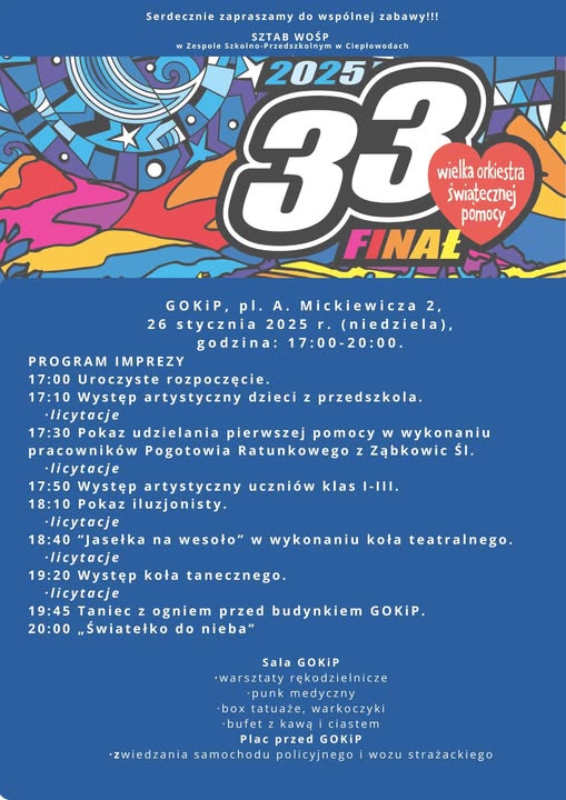 33 finał WOŚP w Ciepłowodach Czas rozpoczęcia 17:00 26 stycznia 2025 Czas zakończenia 20:00 26 stycznia 2025 Adres Ciepłowody Udostępnij: