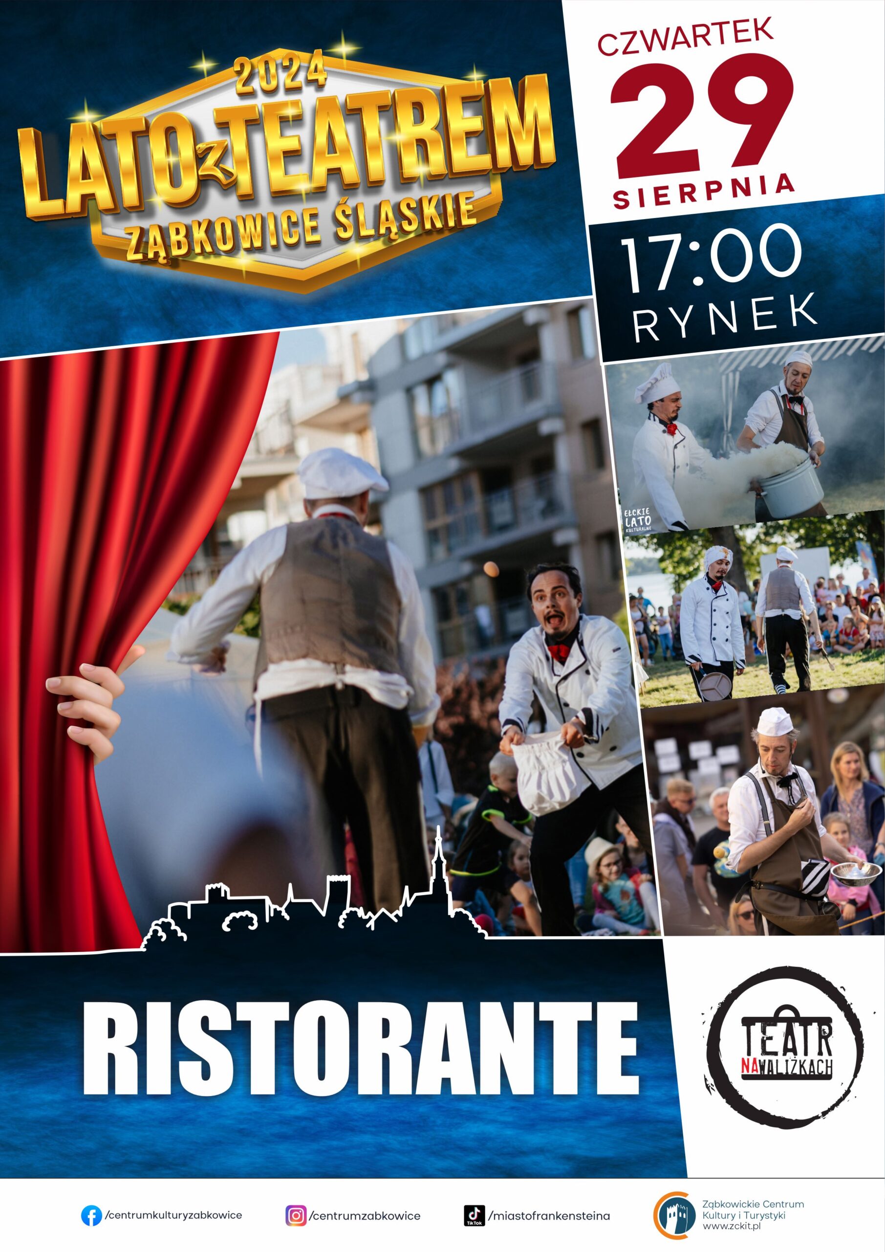 “Ristorante” to garkuchnia pełna niespodzianek oraz zaskakujących sytuacji. Zapraszamy Was do gastronomii pełnej wrażeń i śmiechu. Znajdziecie w niej latające warzywa, najsłodsze torty oraz fajtłapowatych kelnerów. Kucharze żonglują ziemniakami, a jajka rozbijają się nie tylko na patelni. Nasze gagi bywają tak ostre jak papryczki jalapeno oraz jak latające nad publicznością noże. Szef kuchni nie obiecuje, że się najecie do syta, ale gwarantuje ubaw po pachy.