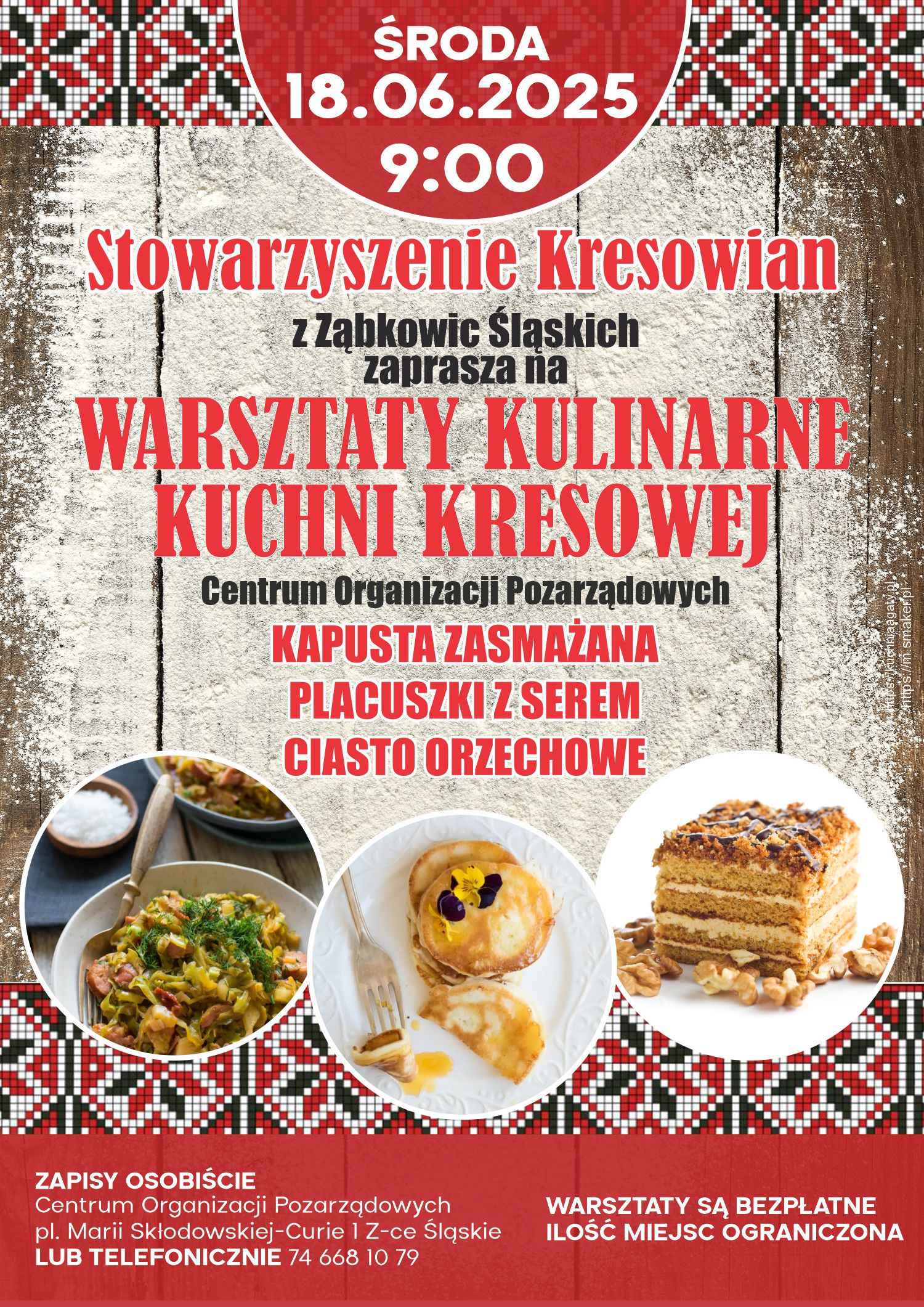 Wraz ze Stowarzyszeniem Kresowian serdecznie zapraszamy na warsztaty kulinarne kuchni kresowej, podczas których wspólnie przygotowywać będziemy tym razem kapustę zasmażaną, placuszki z serem i przepyszne ciasto orzechowe.