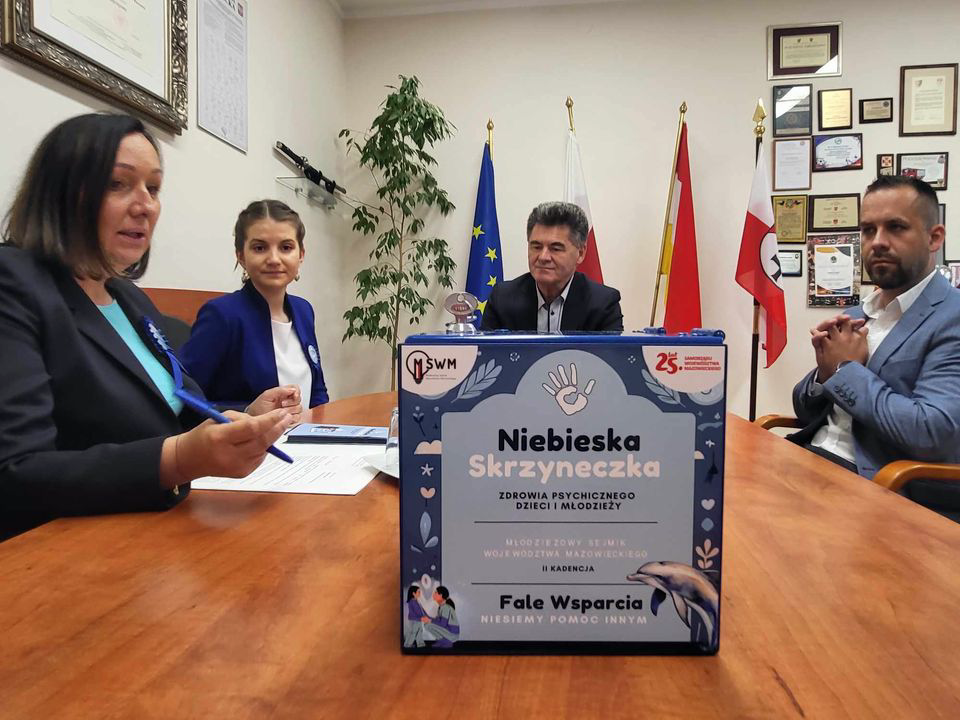 W dniu dzisiejszym Romana Festera – Starostę Ząbkowickiego odwiedzili: Monika Wielichowska – Wicemarszałek Sejmu, Marcelina Maciąg – Przewodnicząca Młodzieżowego Sejmiku Województwa Mazowieckiego oraz Paweł Legana – Przewodniczący Młodzieżowego Sejmiku Województwa Dolnośląskiego. Ideą roboczego spotkania było przedstawienie projektu: „Niebieska Skrzyneczka”, którego pomysłodawczynią i liderką jest właśnie Marcelina Maciąg. „Niebieskie Skrzyneczki Zdrowia Psychicznego” to projekt, który powstał w Młodzieżowym Sejmiku Województwa Mazowieckiego, a patronat nad nim objęli m.in: Monika Wielichowska – Wicemarszałek Sejmu, Izabela Leszczyna – Minister Zdrowia, Barbara Nowacka – Minister Edukacji, czy Monika Horna-Cieślak – Rzecznik Praw Dziecka.