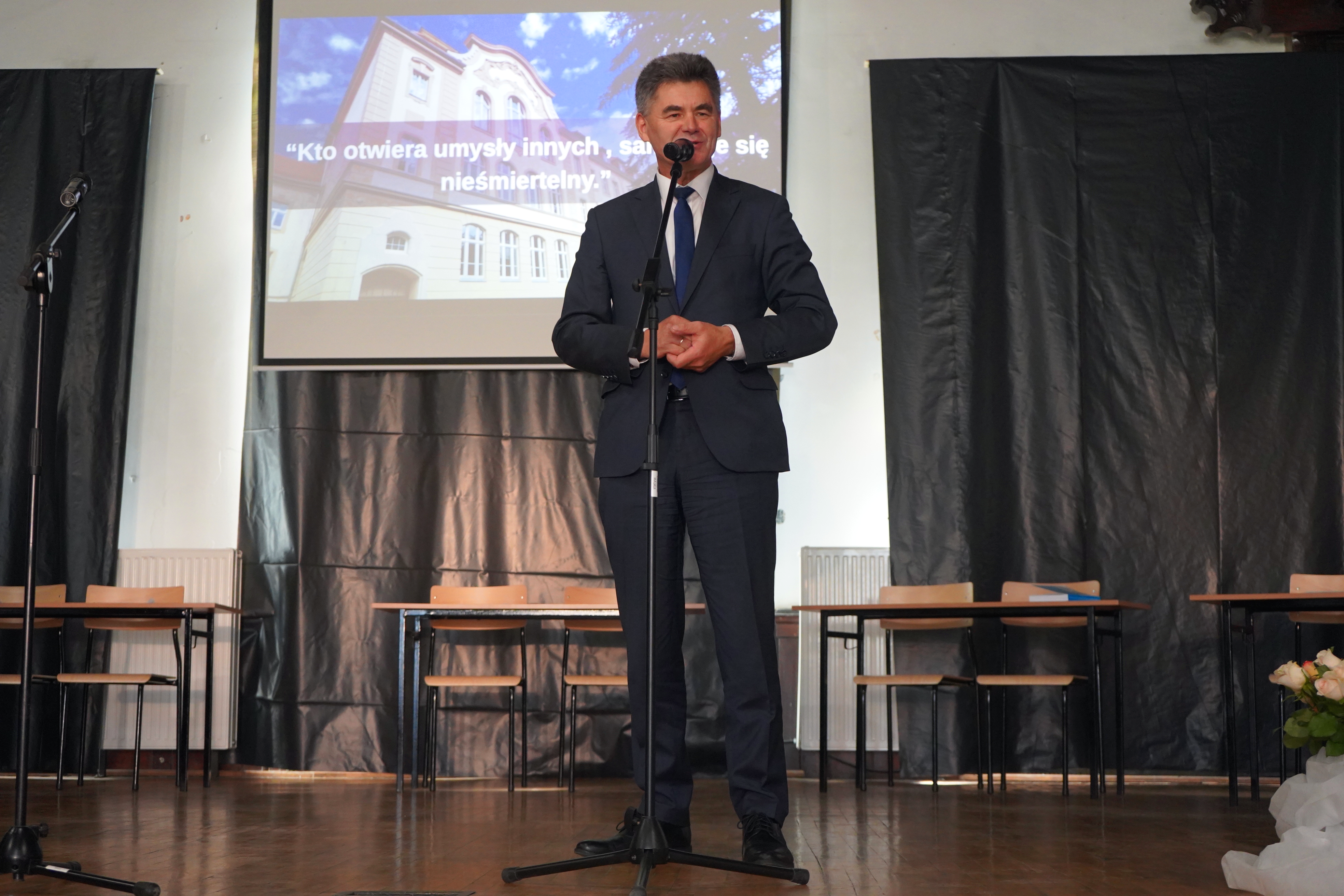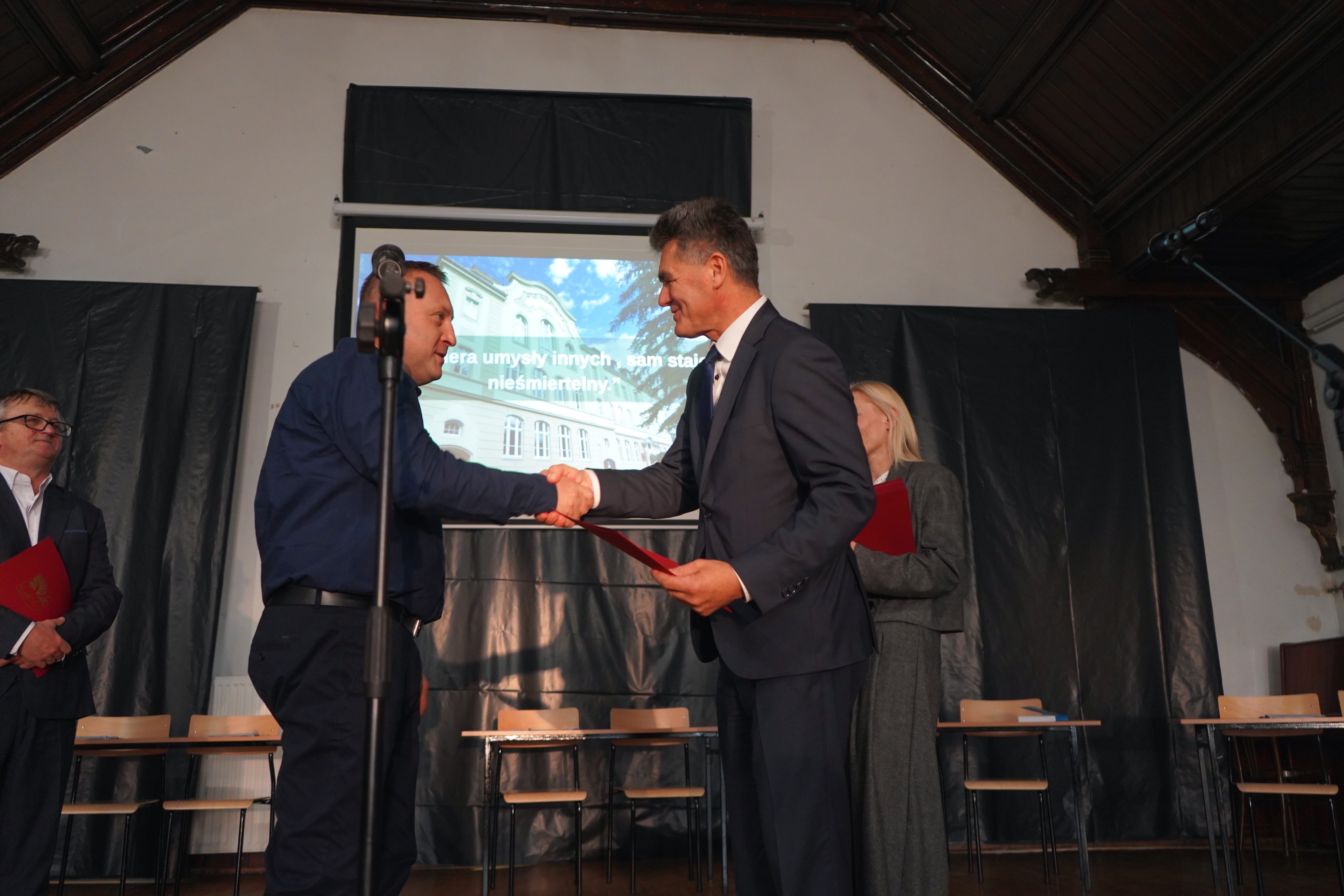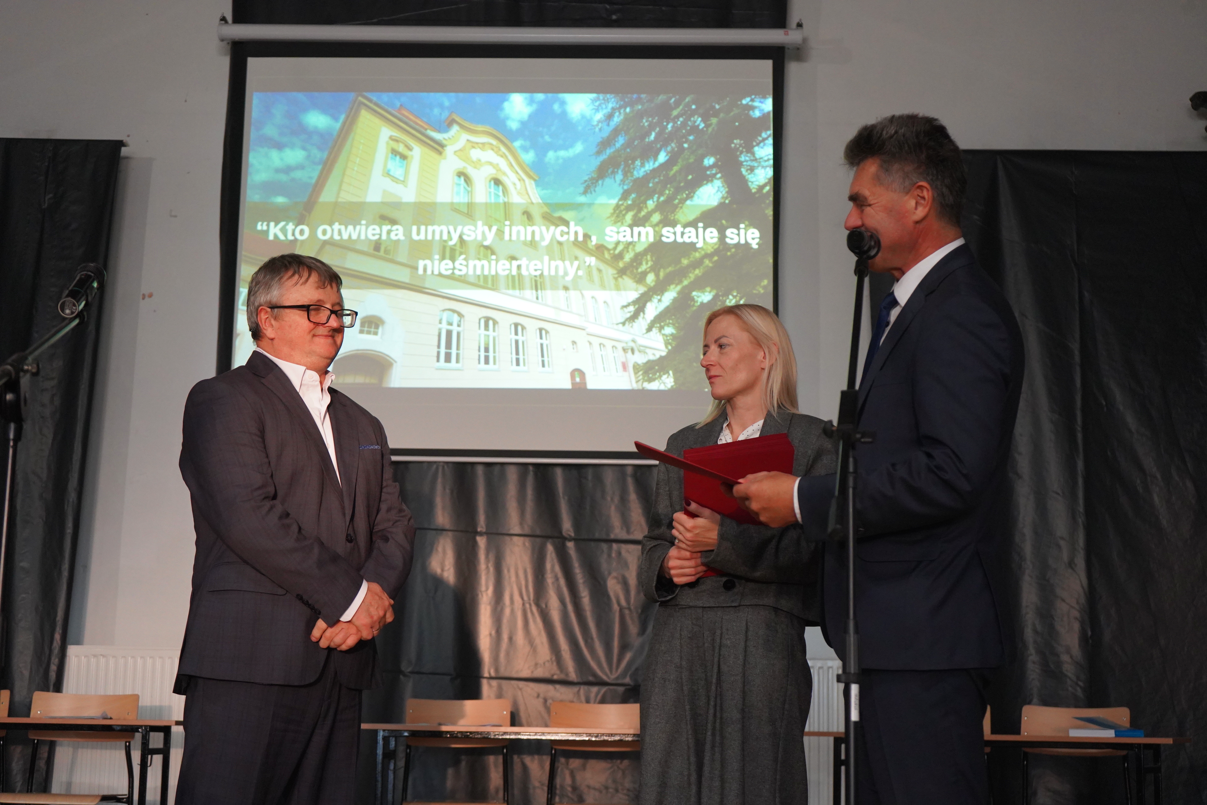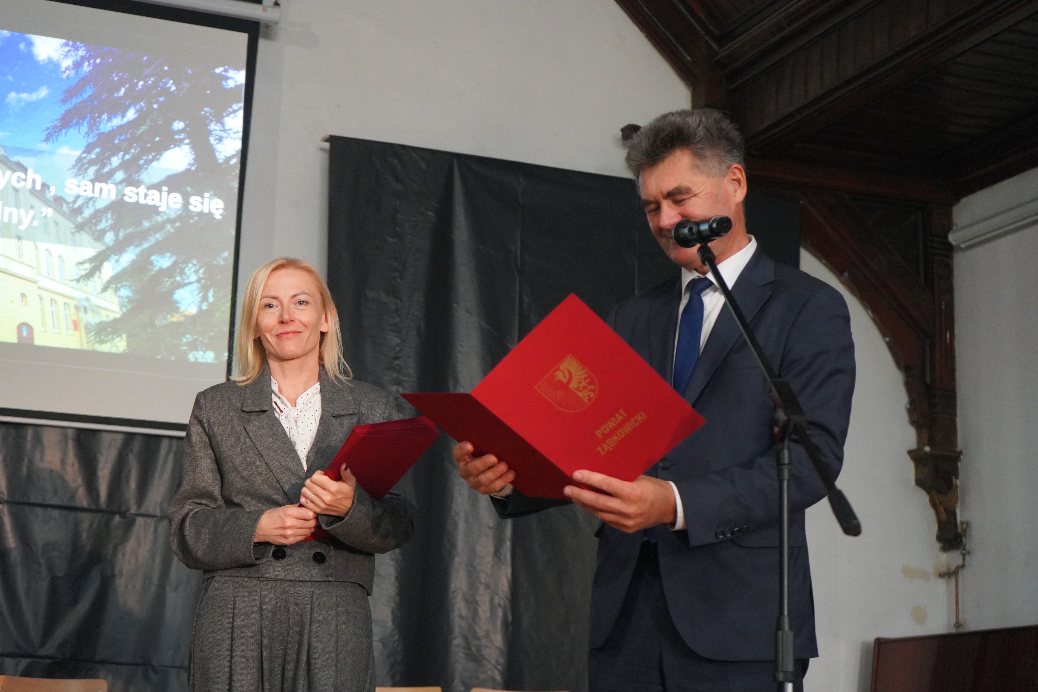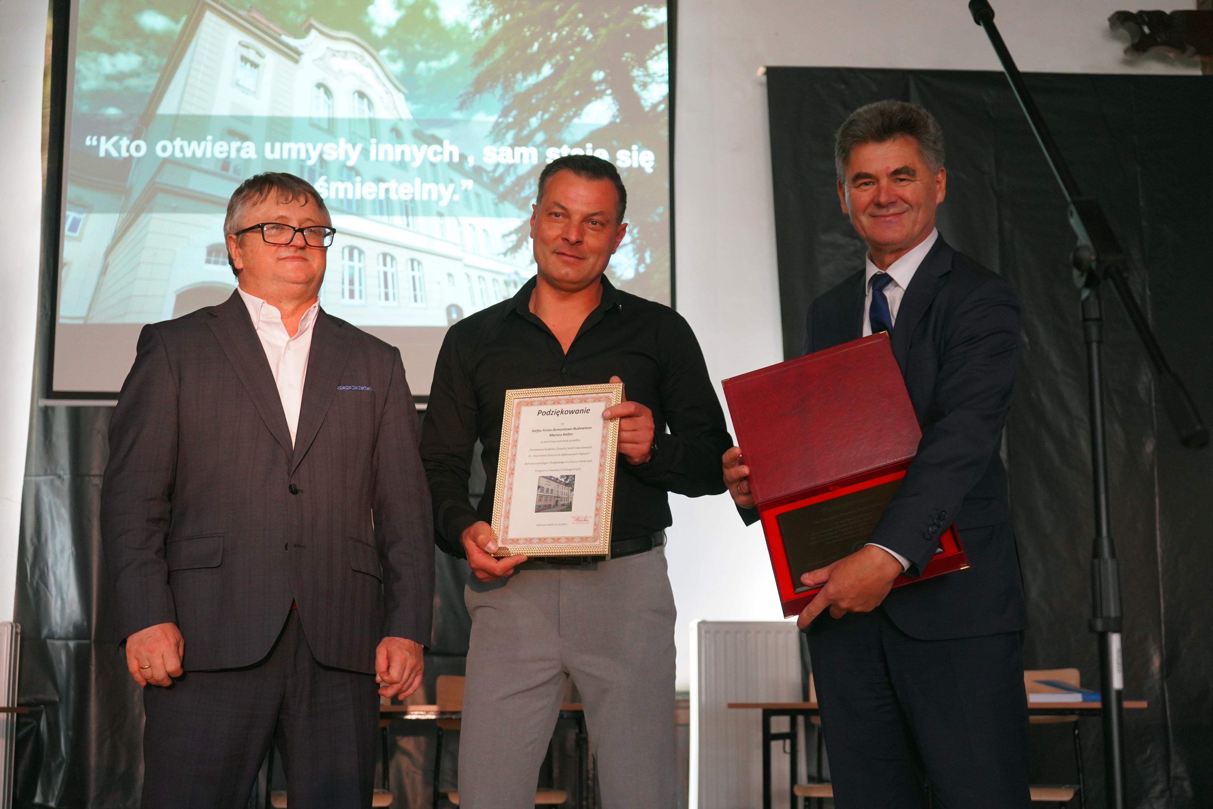Starosta oraz Dyrektor szkoły Ryszard Pawłowski podziękowali firmie Kalfas z Kamieńca Ząbkowickiego, która wykonała renowację elewacji budynku szkoły. Starosta w swoim wystąpieniu wspomniał, że to kolejna, udana inwestycja placówki oświatowej Powiatu Ząbkowickiego, dzięki czemu dziś możemy oglądać piękny i wyremontowany budynek, który odzyskał dawny blask i stał się jednym z ładniejszych w okolicy. Wszystkie wykonane w ostatnim czasie inwestycje oświatowe sprawiają, że szkoły, dla których organem prowadzącym jest Powiat Ząbkowicki, stają się konkurencyjne i atrakcyjne, w stosunku do innych placówek.