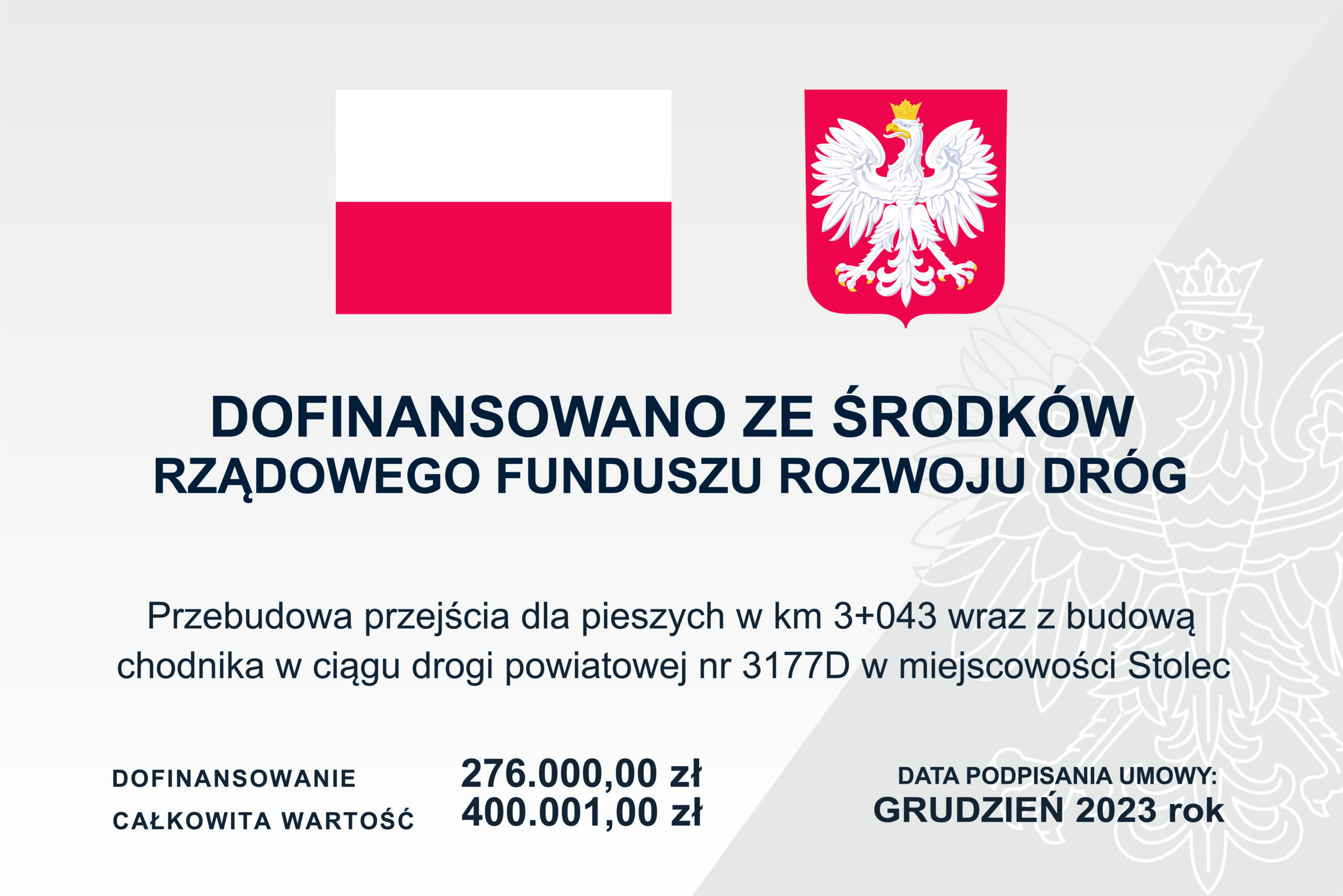 Projekt pn. „Przebudowa przejścia dla pieszych w km 3+043 wraz z budową chodnika w ciągu drogi powiatowej nr 3177D w miejscowości Stolec” objęty jest dofinansowaniem w ramach Rządowego Funduszu Rozwoju Dróg (RFRD) w 2023 roku.