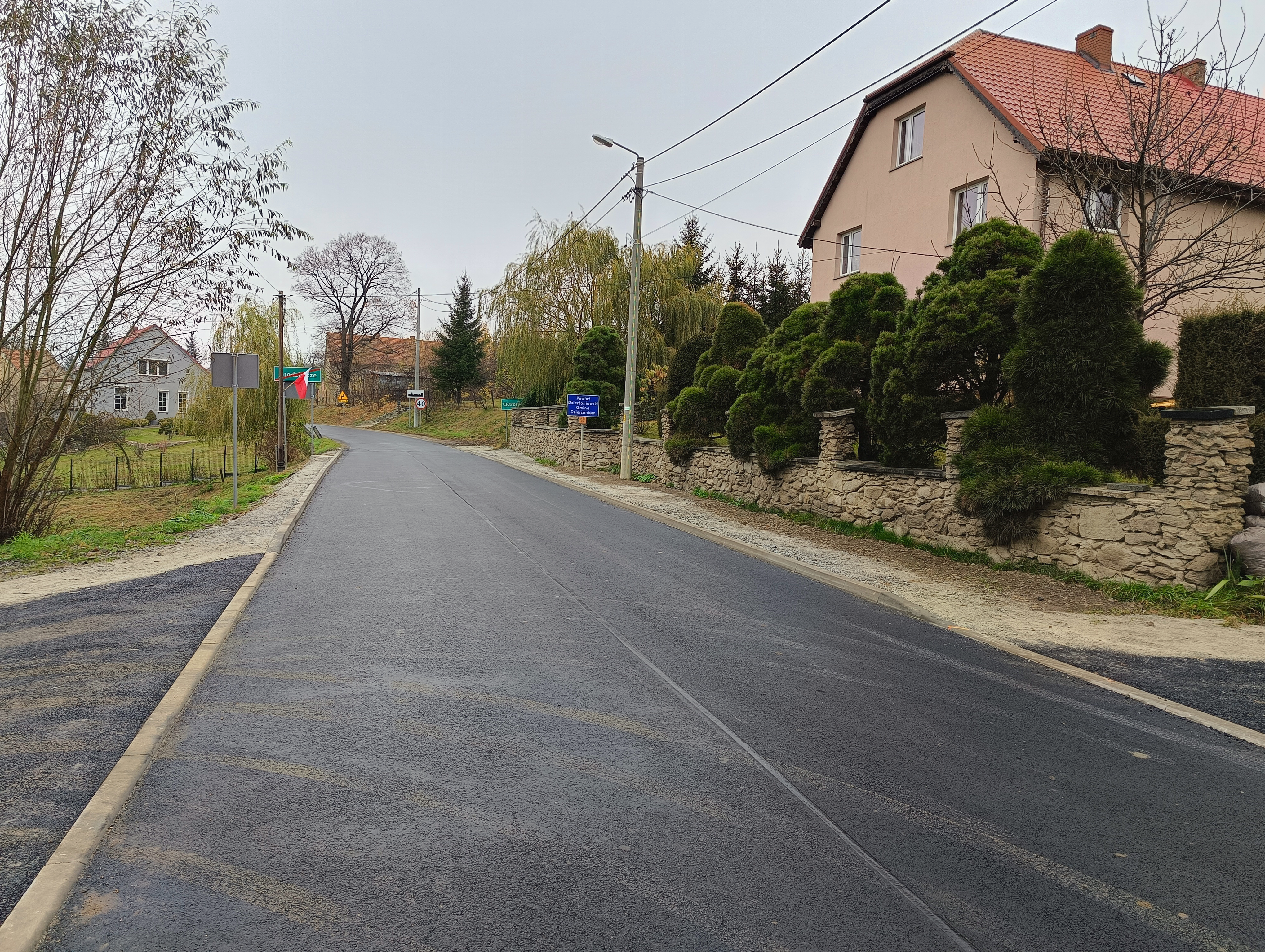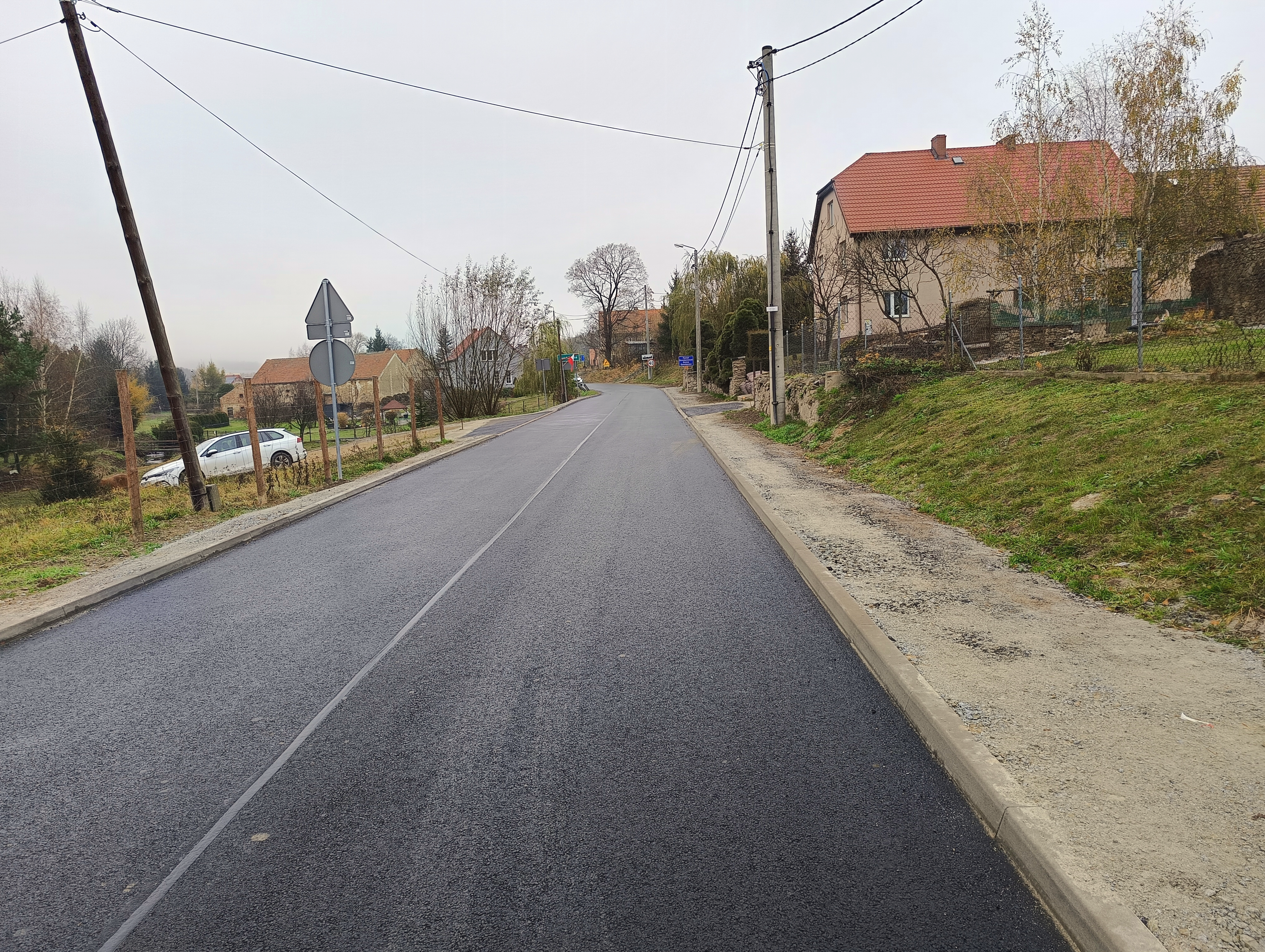 z jednej strony i położono krawężniki, wykonano remont odwodnienia (rowy i przepusty) oraz remont zjazdów.