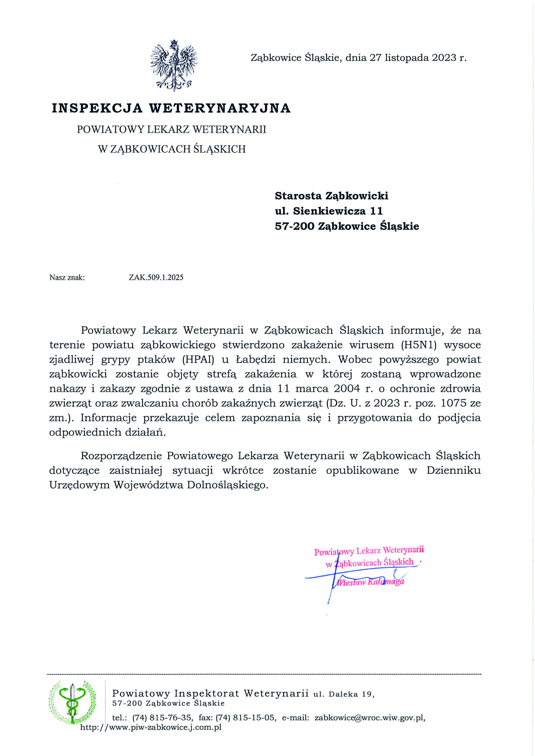 ROZPORZĄDZENIE NR 1/2025 POWIATOWEGO LEKARZA WETERYNARII W ZĄBKOWICACH ŚLĄSKICH Z DNIA 26 listopada 2025 r. w sprawie przeciwdziałania rozprzestrzenianiu się wysoce zjadliwej grypy ptaków (HPAI) na terenie powiatu ząbkowickiego