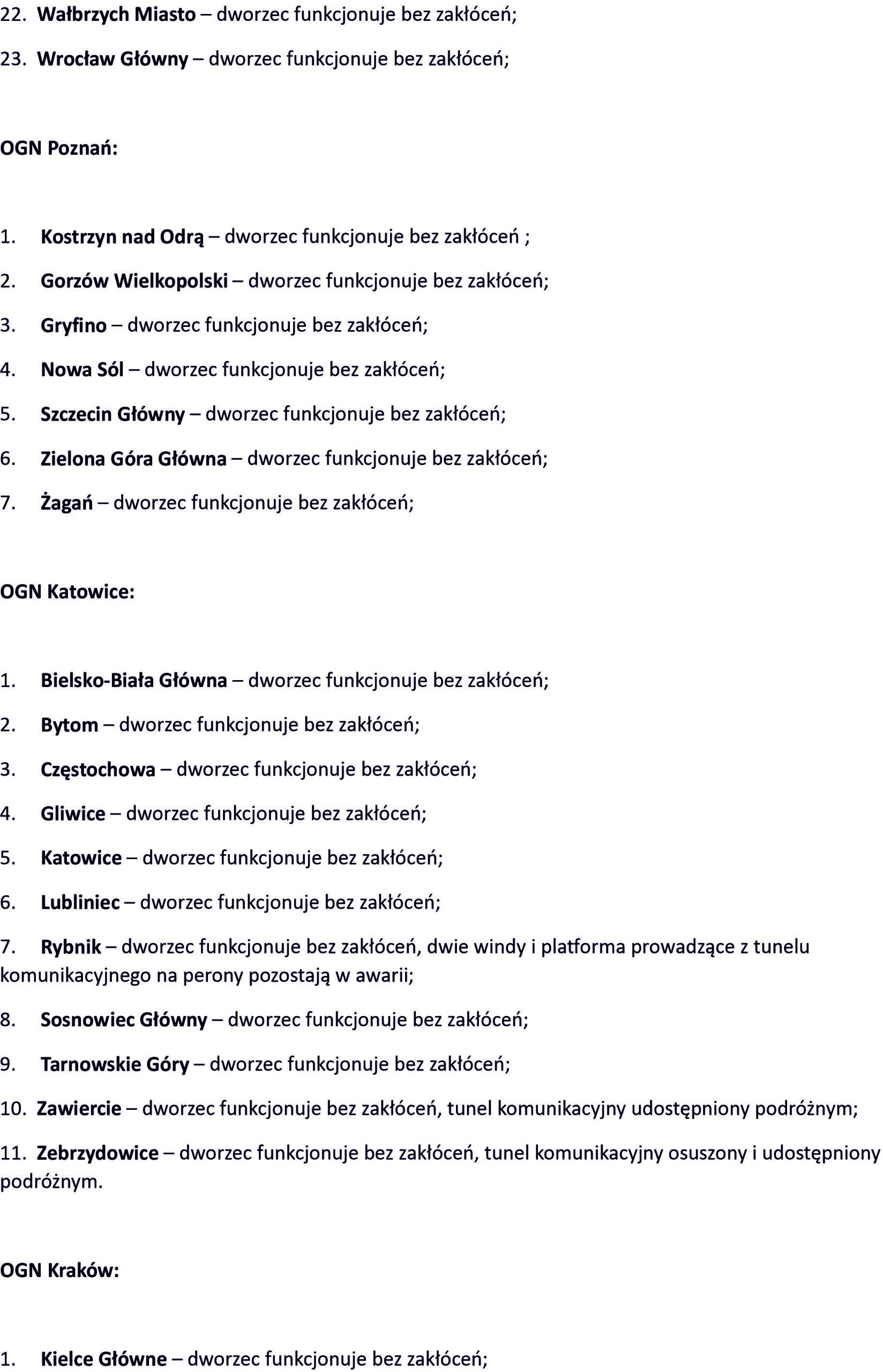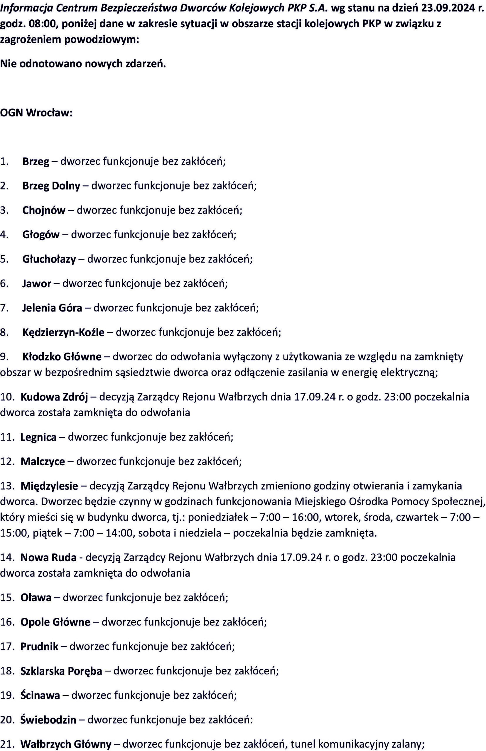 Sytuacja powodziowa na dworcach PKP stan na dzień 23.09.2024 r.