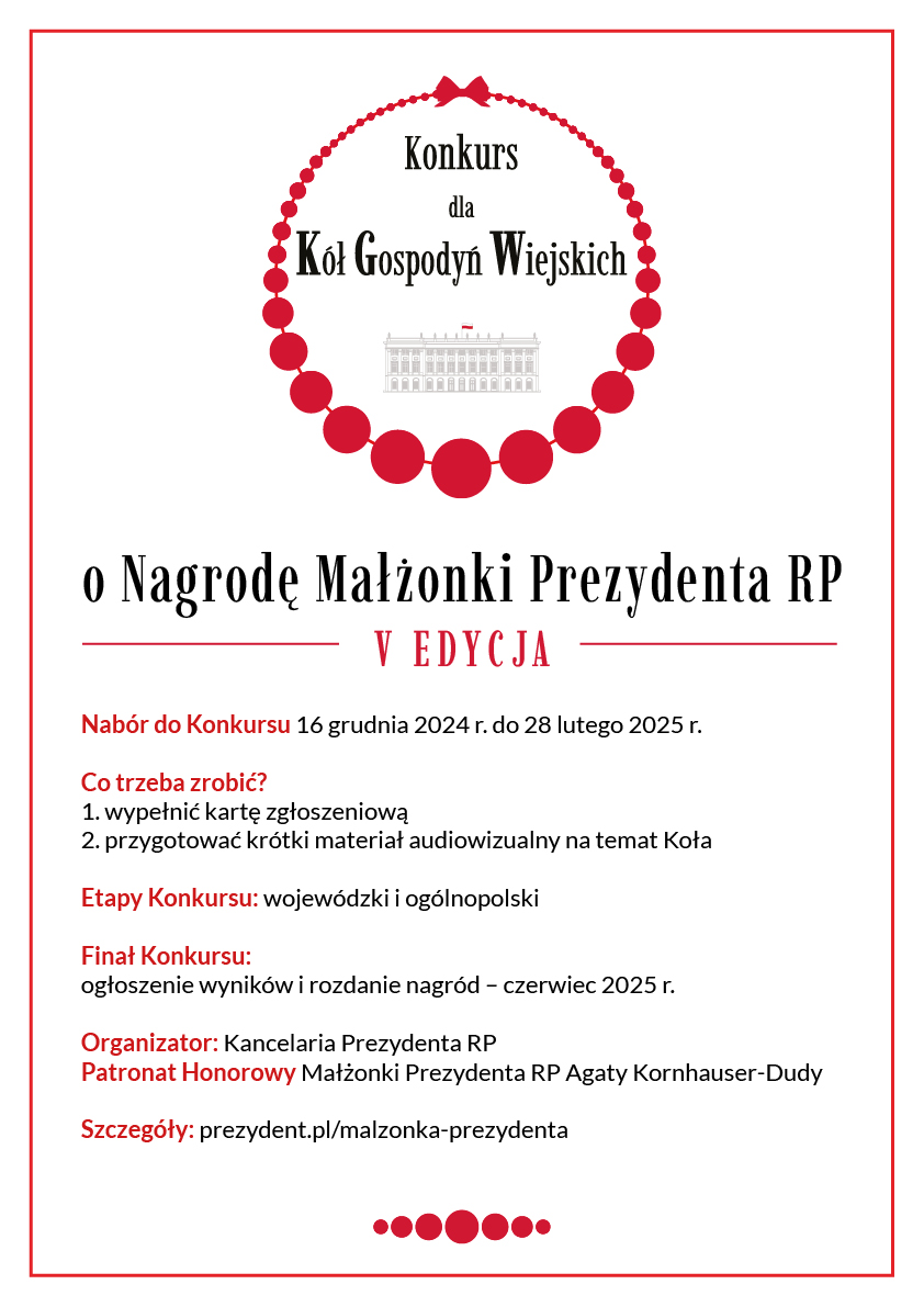 ✅Kancelaria Prezydenta Rzeczypospolitej Polskiej organizuje V edycję Konkursu dla Kół Gospodyń Wiejskich o Nagrodę Małżonki Prezydenta RP.