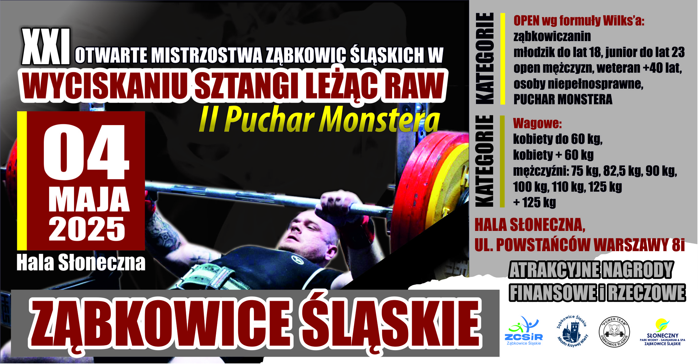 Już 4 maja 2025 roku w Hali Słonecznej w Ząbkowicach Śląskich odbędą się XXI Otwarte Mistrzostwa Ząbkowic Śląskich w Wyciskaniu Sztangi Leżąc RAW oraz II Puchar Monstera. To wydarzenie sportowe przyciągnie najlepszych zawodników z całej Polski, oferując emocjonującą rywalizację i cenne nagrody.