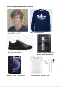 W przypadku zauważenia podobnego chłopca, prosimy o kontakt do rodziny pod nr telefonu 604 944 800 lub wypełnienie zgłoszenia https://dyminski.pl/zglos-jesli-widziales-poszukiwanego/.
