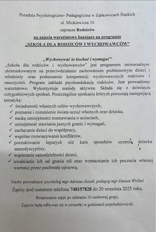 Zajęcia warsztatowe bazujące na programie „SZKOŁA DLA RODZICÓW I WYCHOWAWCÓW” – „Wychowywać to kochać i wymagać”