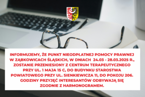 - Zmiany w przyjmowaniu interesantów w Punkcie Nieodpłatnej Pomocy Prawnej w Ząbkowicach Śląskich w dniach 24.03 – 28.03.2025 r.